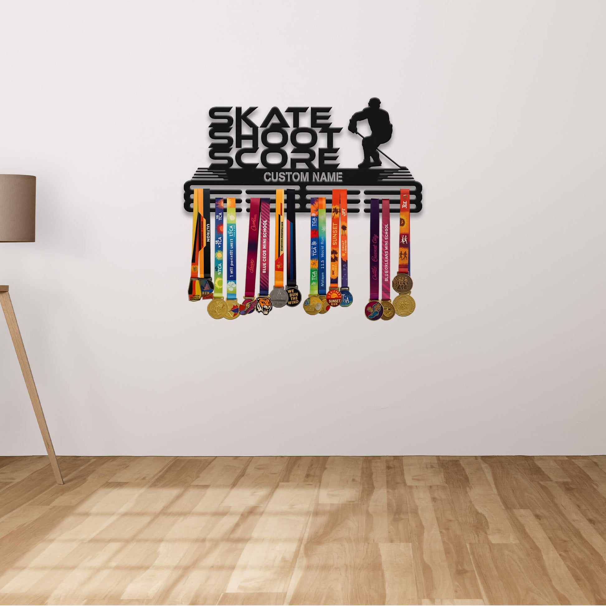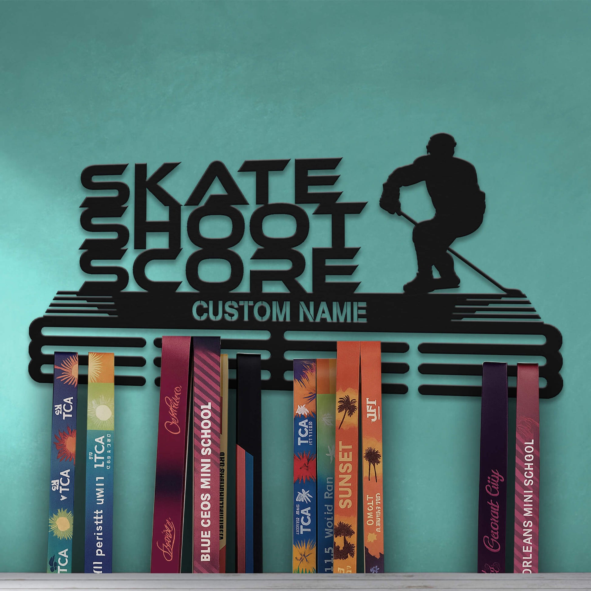 Stainless Steel Ice Hockey Medal Hanger “Skate Shoot Score” – Personalized Medal Display | ChampionHanger